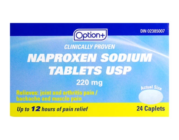 Medicinal Ingredient (in each caplet): Naproxen sodium 220mg (NSAID) – Pain relief, fever reducer.